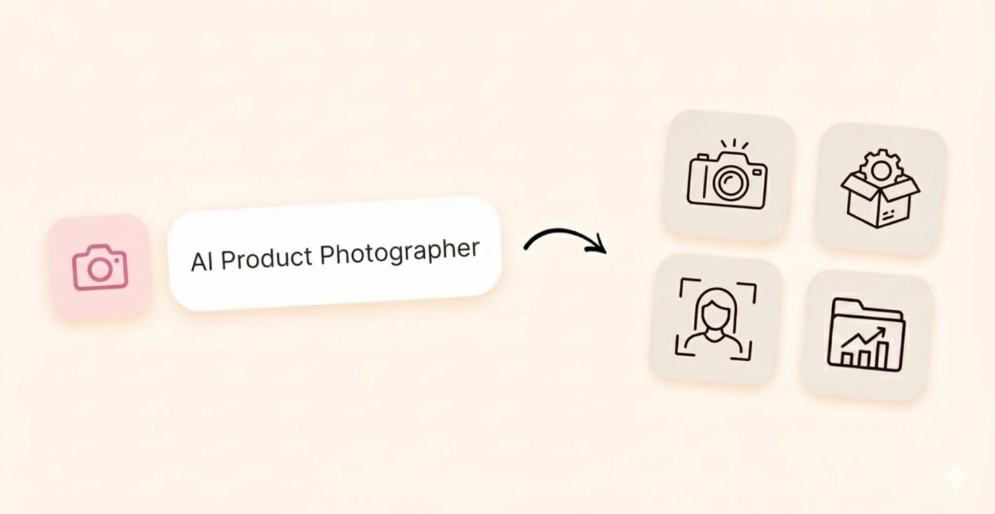 The Product photographer agent uses AI models and workflow templates to execute tasks automatically. Dual-model image generation pipeline for catalog + PDP product photography.