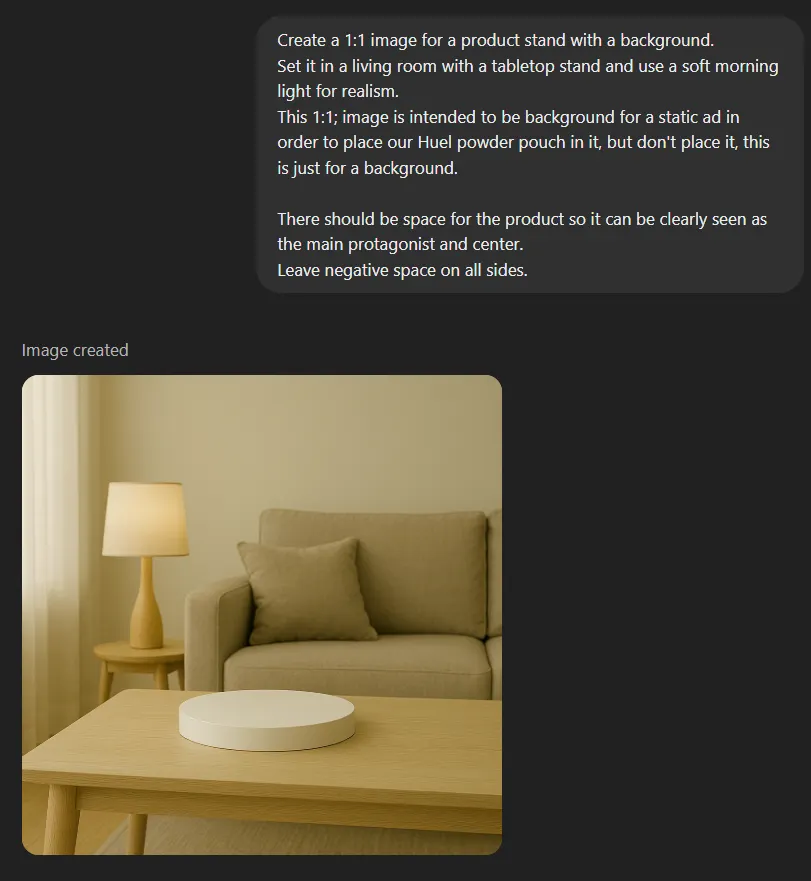 “I’m creating a static ad for [PRODUCT]. Generate a product image that features:
